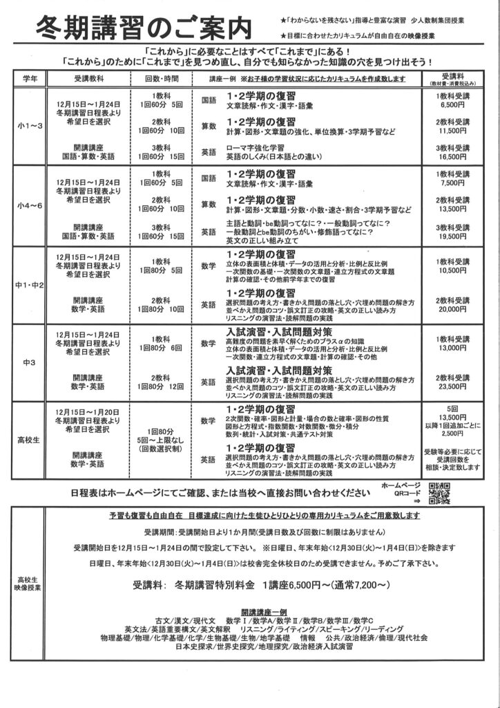 冬期講習のご案内 こちらは、今年の冬期講習に関するご案内として、当塾の塾生にお配りしているものです。受講をご希望の方は、お電話または公式LINEなどでご一報いただけましたら、後日希望日程表をお渡し致します。 2025.12.06 戻る